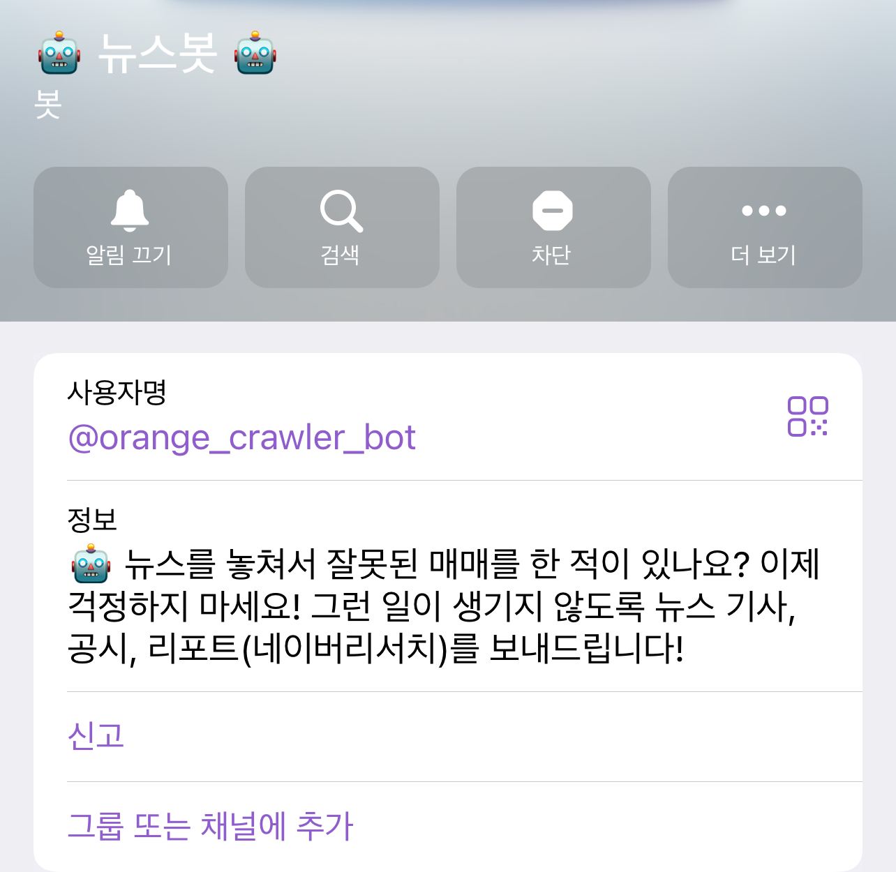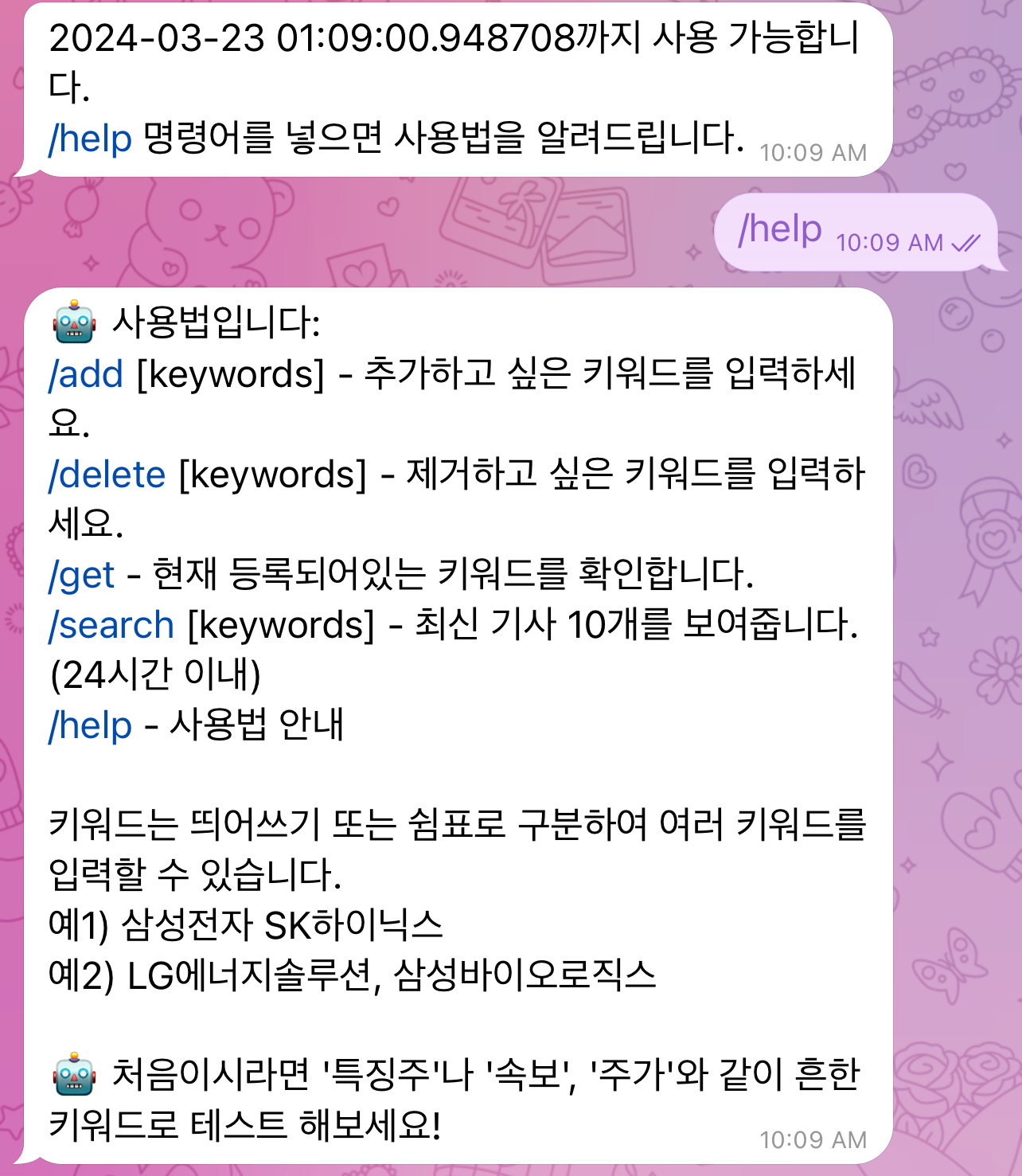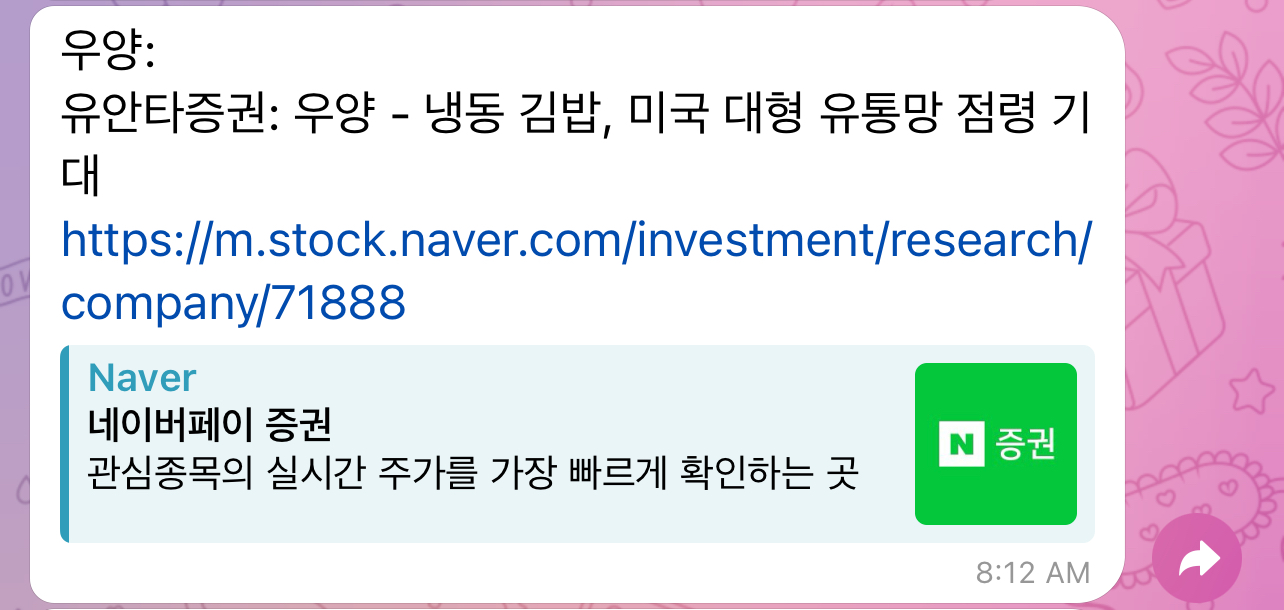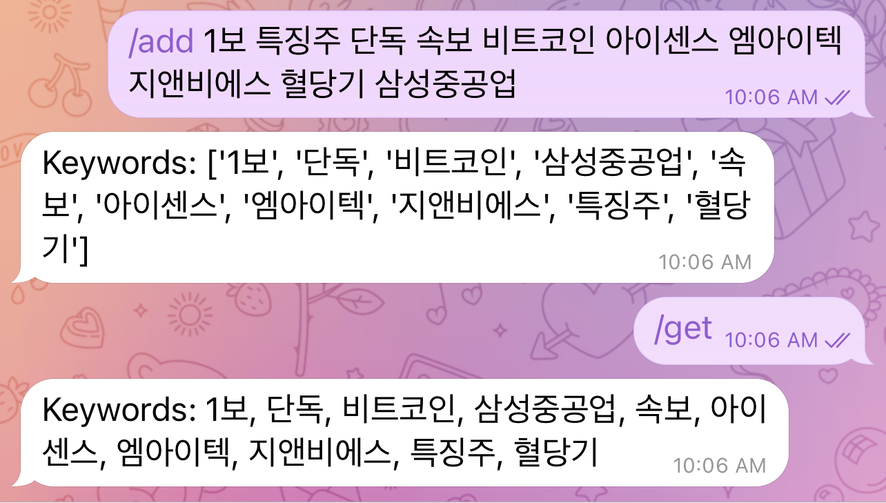 앱을 대체할 수 있는 것이 텔레그램 봇이다. 주식을 하는 사람이라면 무릇 텔레그램 앱정도는 깔려있는 경우가 많다. 텔레그램만 있으면 되므로 가볍고 편리하다. 내가 원하는 키워드만 설정하여 맞춤형으로 뉴스 알림을 받을 수 있어서 좋고, 따로 포탈사이트에서 종목별로 뉴스 검색을 하는 시간을 절약해준다. 중요한 소식은 놓치지 않고 시의적절하게 받을 수 있다는 장점이 있다.