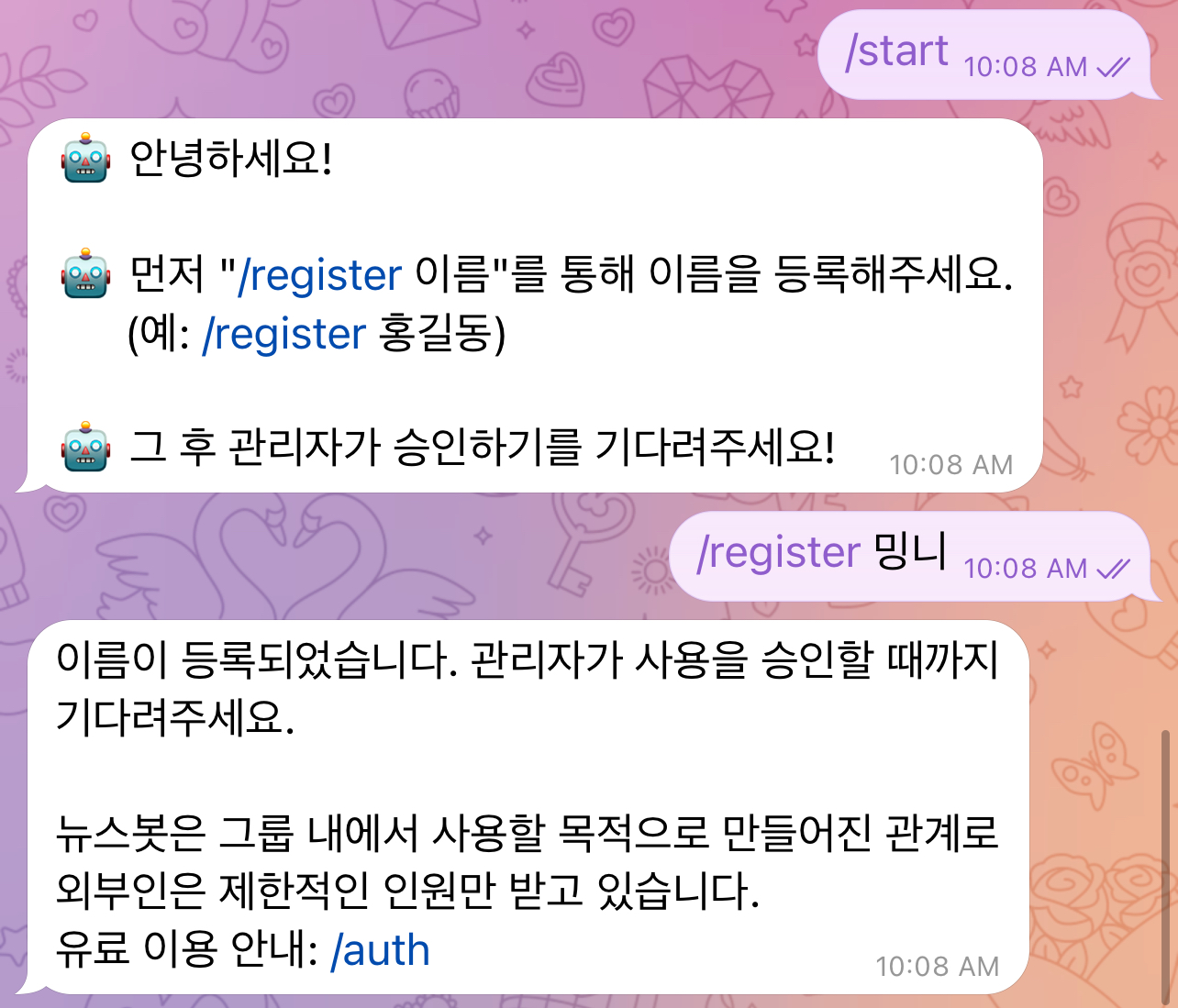 뉴스봇에서 /auth를 입력하면 안내문이 나온다.