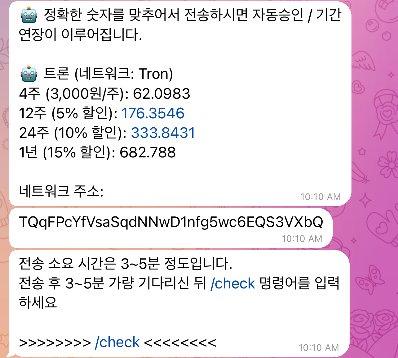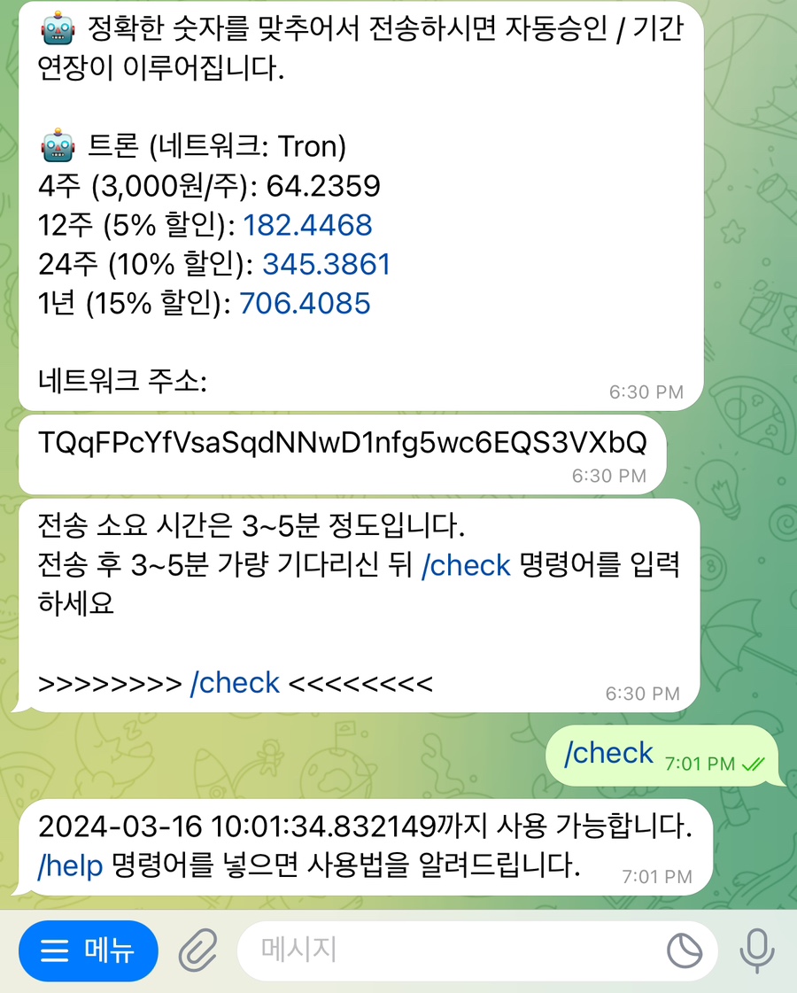 전송 후 /check를 입력하면 저런식으로 사용기간과 함께 사용 승인 메시지가 날아온다.