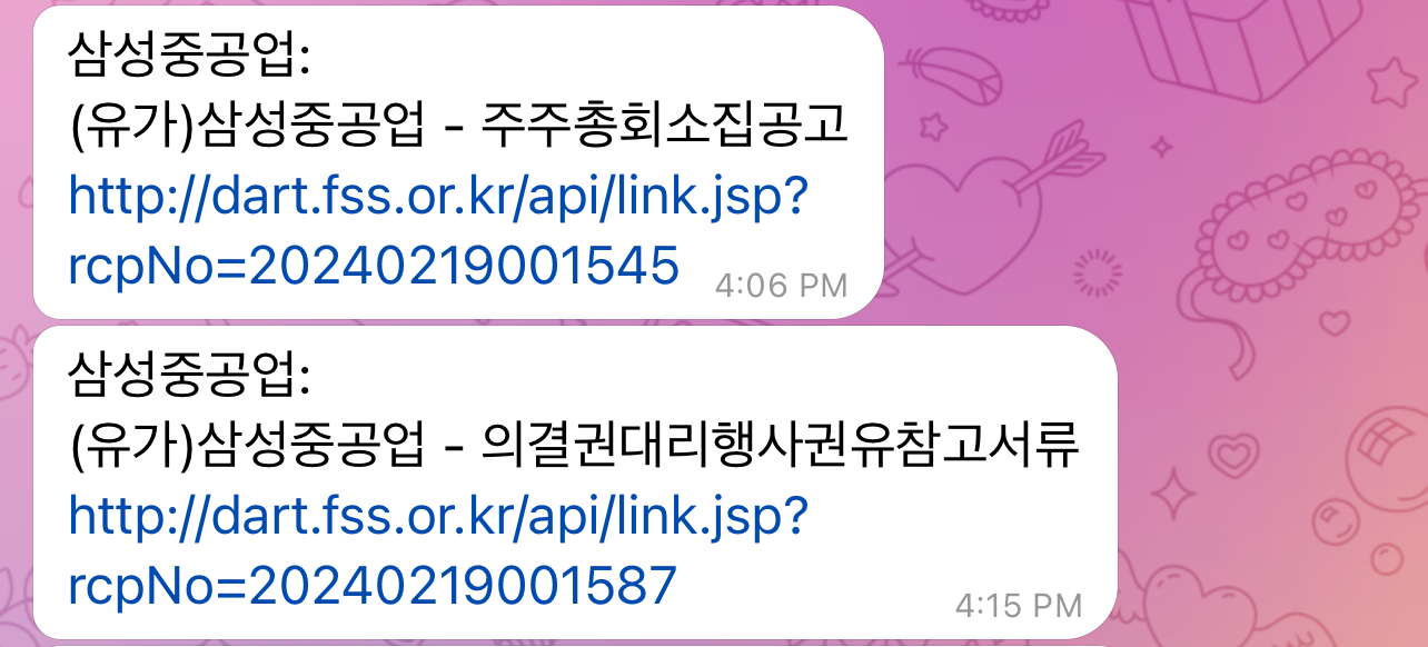 키워드 관련하여 공시가 나오면 공시도 제목과 함께 링크를 보내준다.