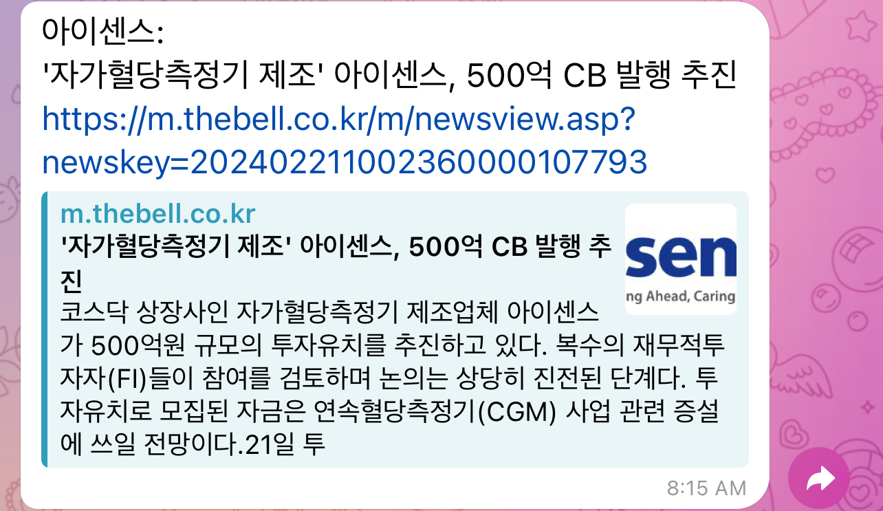 이런식으로 아이센스 뉴스가 나오는 경우 텔레그램으로 제목과 함께 뉴스 링크를 보내준다.