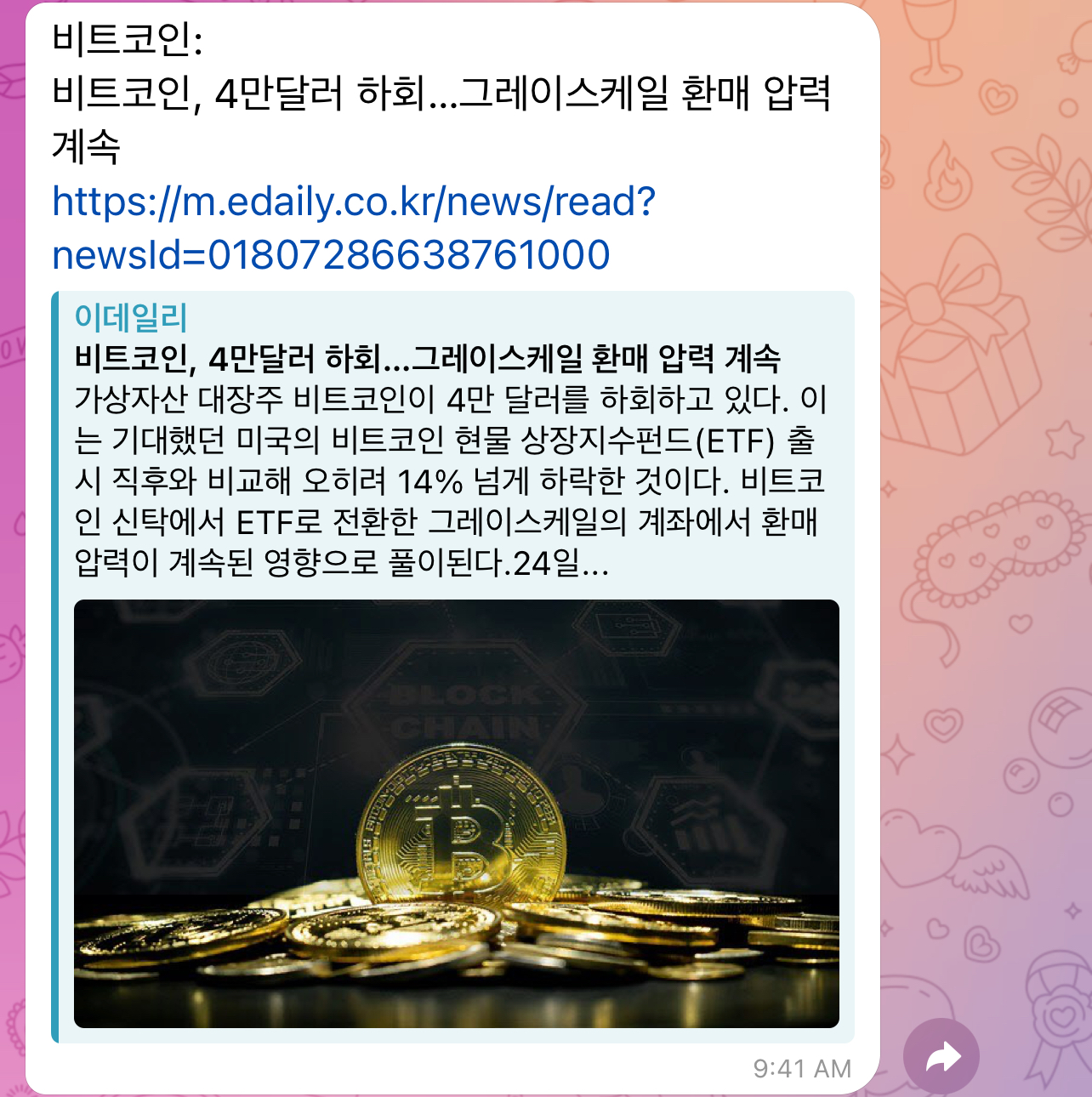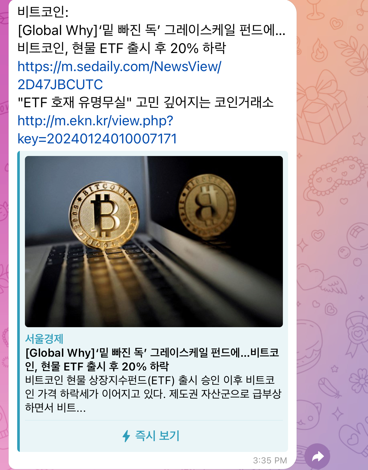 한동안은 비트코인이 현물 ETF 승인 이후 그레이스케일 환매 압력에 의해 계속 하락한다는 기사가 왔다.