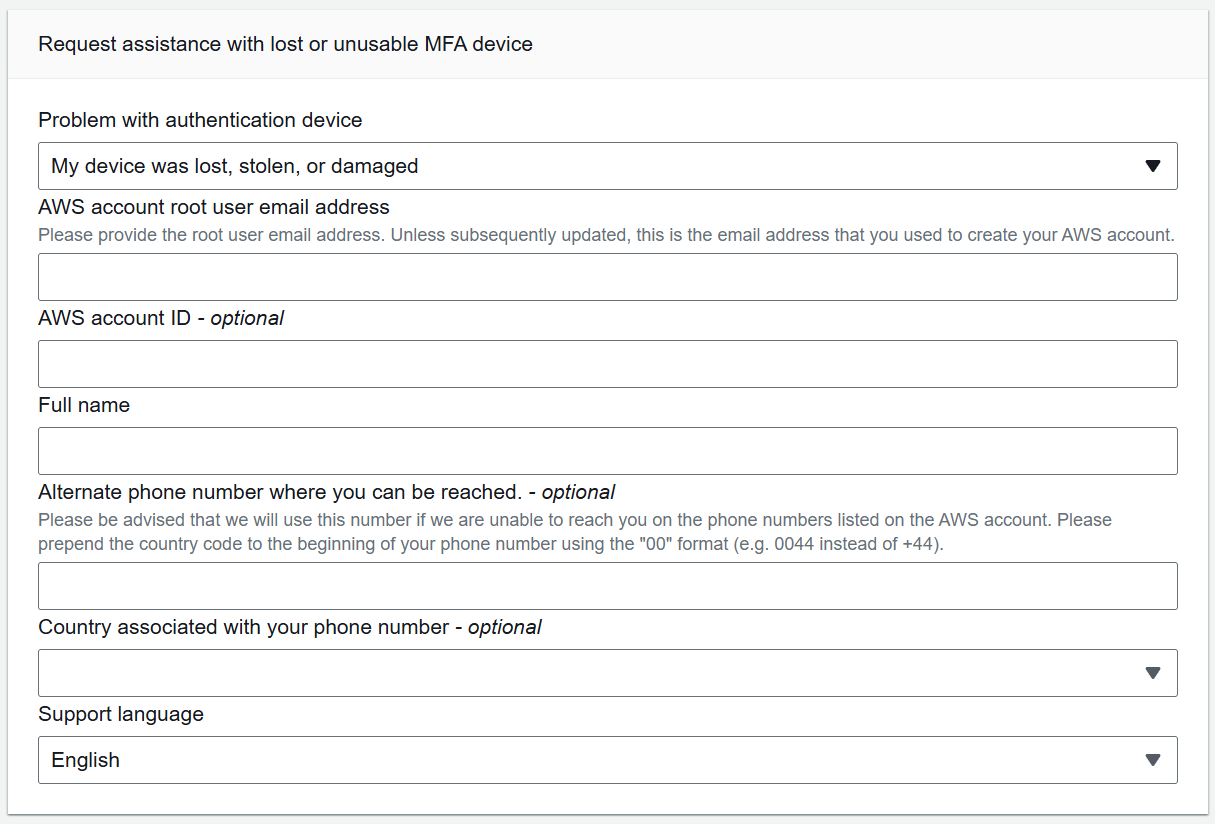 "We are not able to change the phone number on the account. If you can't complete the account’s security verification steps with AWS MFA Support, then provide us with the following supporting documentation.